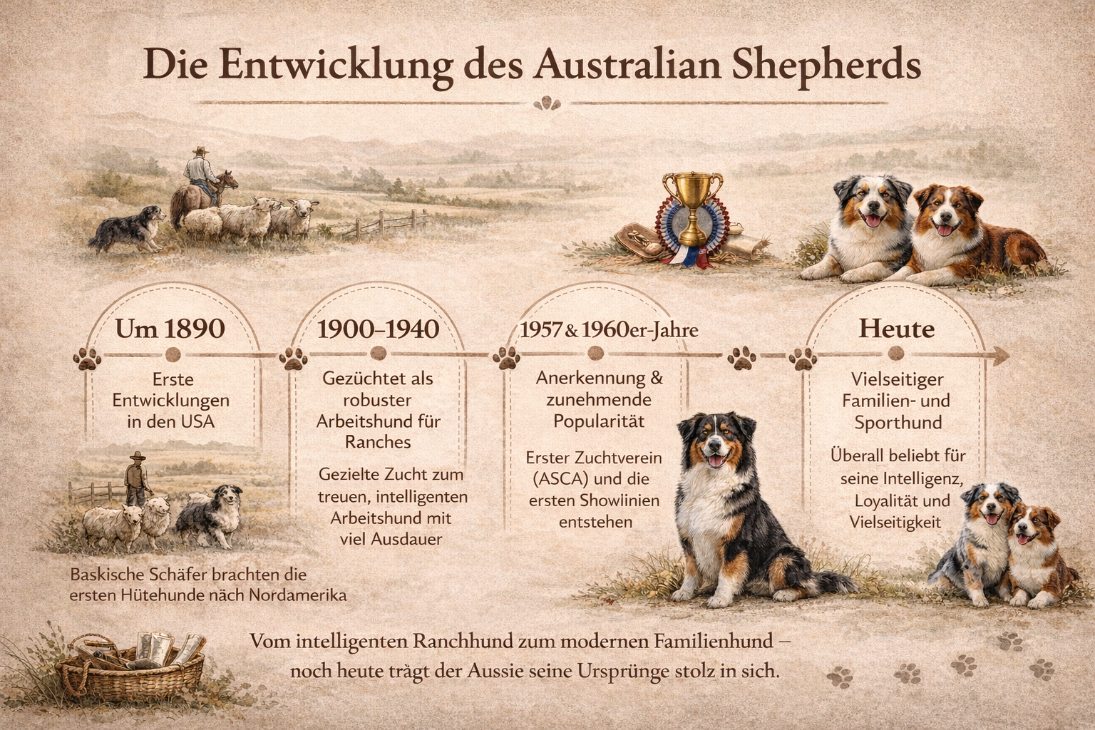 Gerade diese Mischung aus Intelligenz, Loyalität und Anpassungsfähigkeit macht den Aussie zu einer so besonderen Rasse – damals wie heute.
